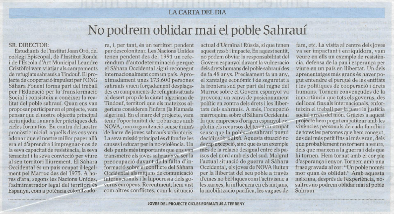 Aquest matí ens hem llevat amb la carta del dia al diari Segre que ens parla del conflcte sahrauí.