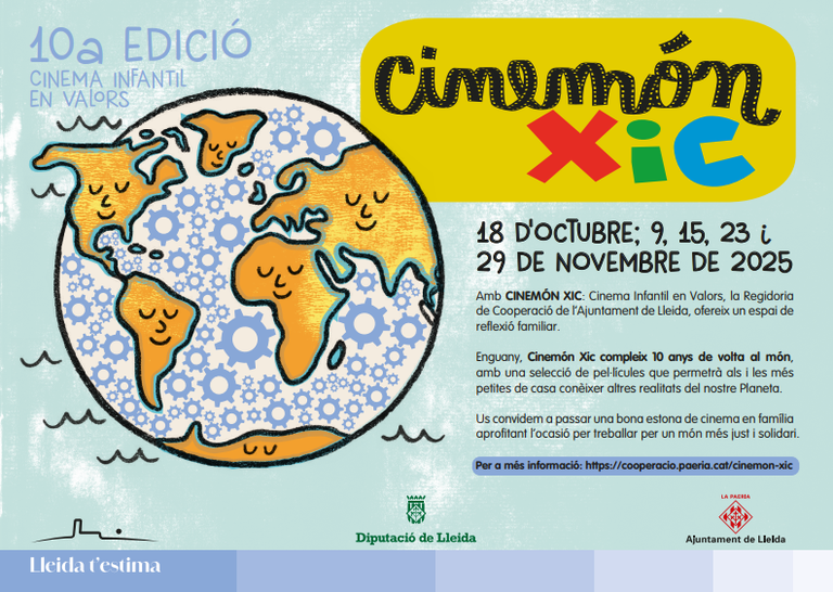 Us presentem la 10a edició de cinema infantil en valors a Lleida: CINEMÓN XIC! Amb CINEMÓN XIC la Regidoria de Cooperació de l’Ajuntament de Lleida, ofereix un espai de reflexió familiar adaptat a la infància. Enguany, el cicle compleix 10 anys de volta al món, amb una selecció de pel·lícules que permetrà als i les més petites de casa conèixer altres realitats del nostre Planeta. Us convidem a passar una bona estona de cinema en família aprofitant l’ocasió per treballar per un món més just i solidari.